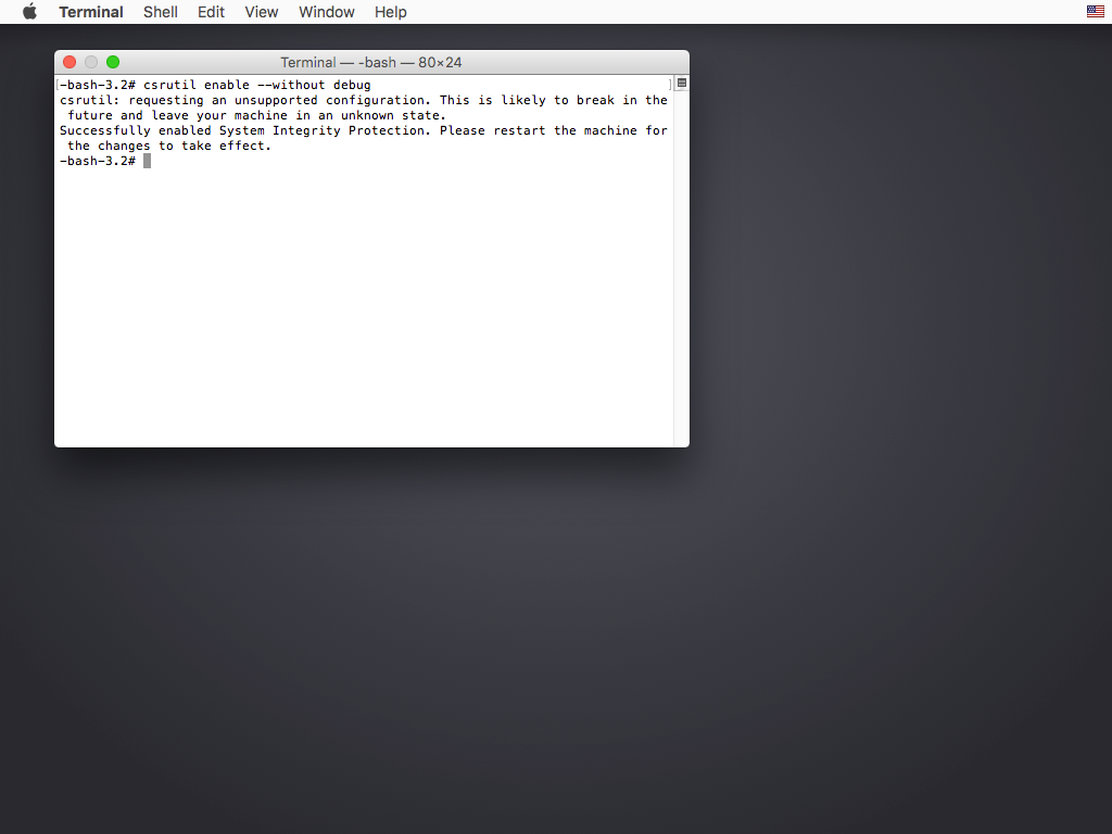 System Integrity Protection (SIP) is a new security feature introduced by Apple. That’s good, but unfortunately it prevents TotalTerminal from augmenting Terminal. This article will tell you how to configure your machine, so that you can use TotalTerminal. Before you do this, it is important to get informed about what System Integrity Protection is, and what it means to turn it off. Technical details are well covered in SIP review on Ars Technica. Apple also provided some information here.