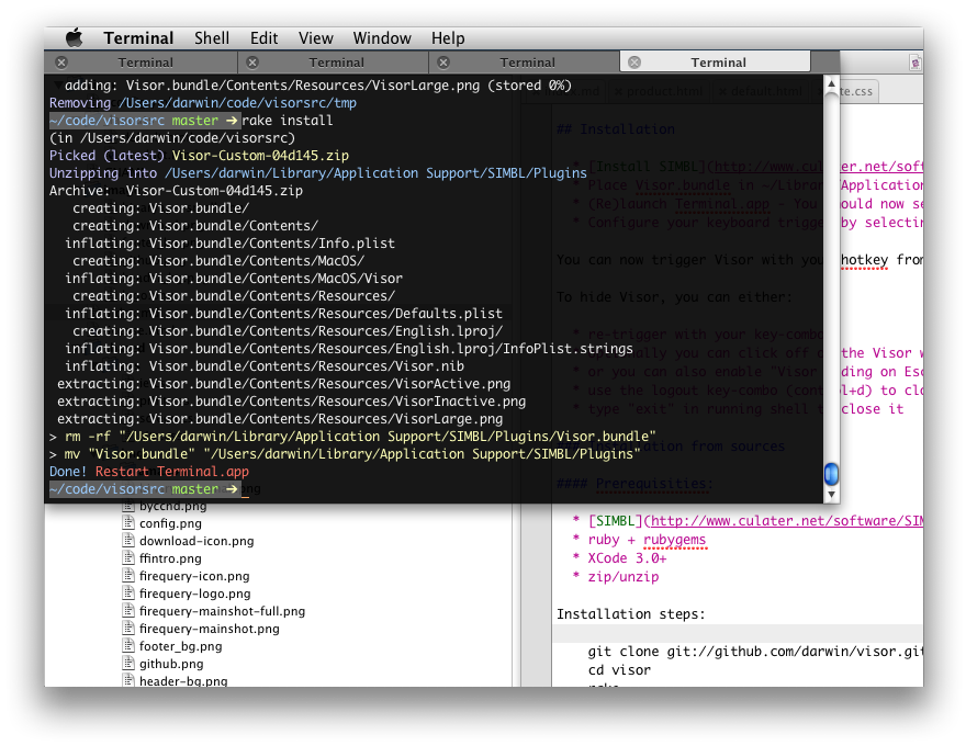 TotalTerminal supersedes Visor. Visor.bundle is a SIMBL plugin which was originally written by Nicholas Jitkoff from Blacktree. Original Visor was introduced for OS X - Tiger. I have been developing it since Leopard. I decided to rename it to TotalTerminal with OS X Lion release. TotalTerminal has installer, Sparkle updater and does not depend on SIMBL. In the future it will get more bug fixes and hopefully some new features.